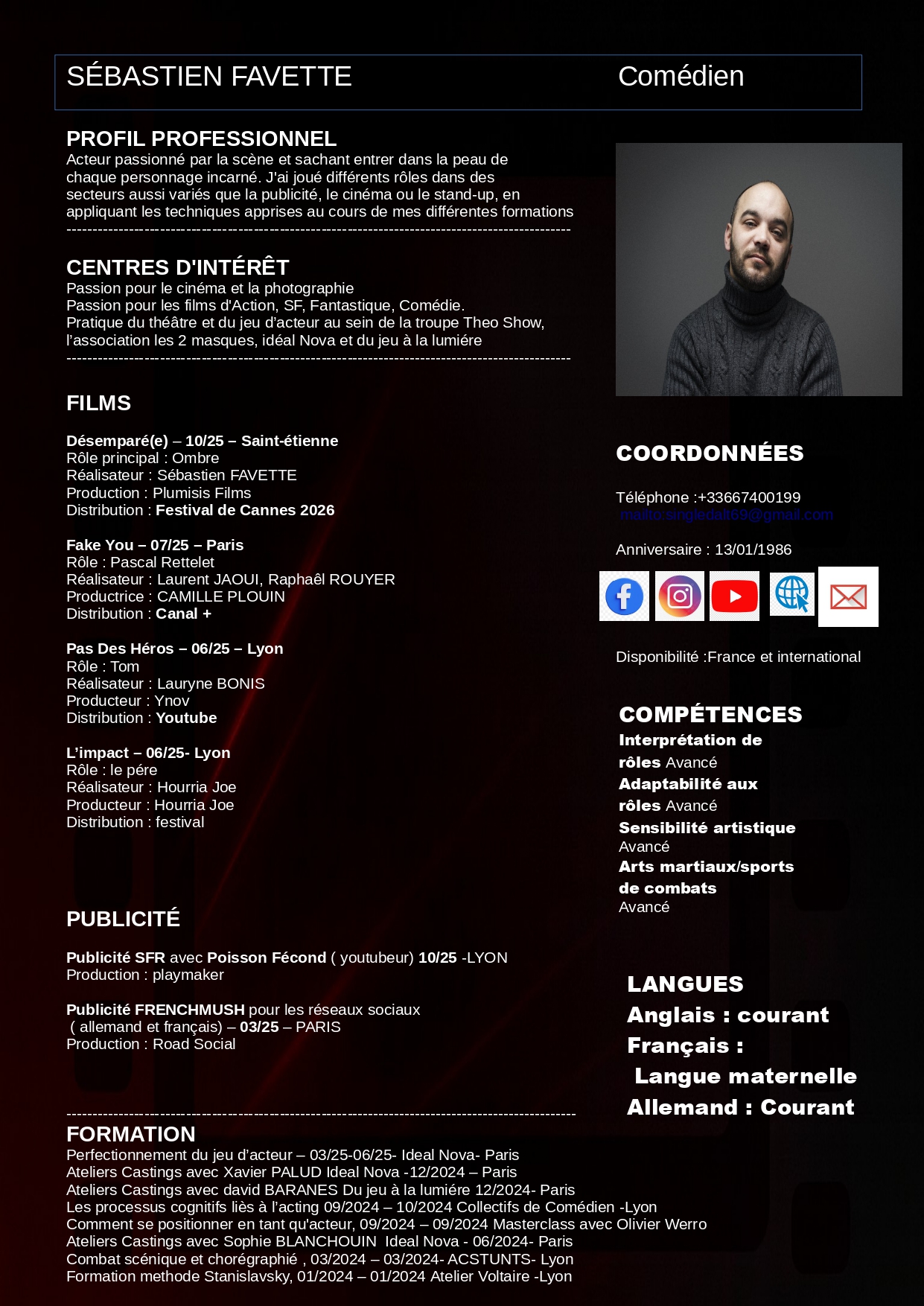 🎬 Sébastien Favette – Acteur français polyvalent Rôles intenses et crédibles | Cinéma, TV, Publicité Bande démo 2026 & CV disponibles 📧 Contact pro : singledalt69@gmail.com